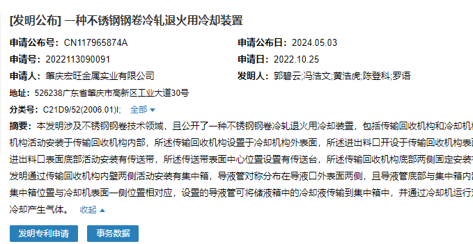 5月3日,肇慶宏旺金屬實業(yè)有限公司成功申請一項名為“一種不銹鋼鋼卷冷軋退火用冷卻裝置”專利,申請公布號CN117965874A,申請日期為2022年10月25日。